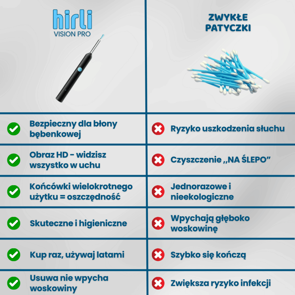 Urządzenie HIRLI Vision PRO powstało z myślą o tych, którzy chcą skutecznie i bezpiecznie dbać o higienę uszu — w domu, bez ryzyka.