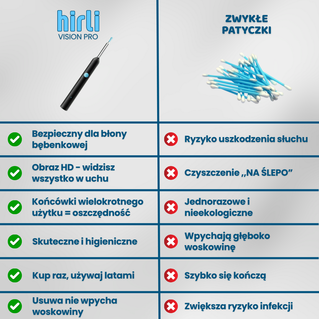 HIRLI Vision PRO to rozwiązanie stworzone z myślą o wszystkich — od najmłodszych po seniorów. Dzięki kamerze HD 1080p zyskujesz pełną kontrolę nad czyszczeniem uszu, bez ryzyka i bez zgadywania.